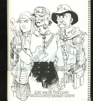 But I started out fairly slow and got slower as the years progressed. Here's a page from one of my sketchbooks. I like the woman's t-shirt design. This was drawn back when I was beginning to become more interested in how real clothes drape and fold on a human body, and therefore less interested in drawing people in skin tight costumes, making me more and more unfit for superhero work. There may be a story in Joey Sato's Discount Backcountry Ranger Corps someday, but then again, maybe not.